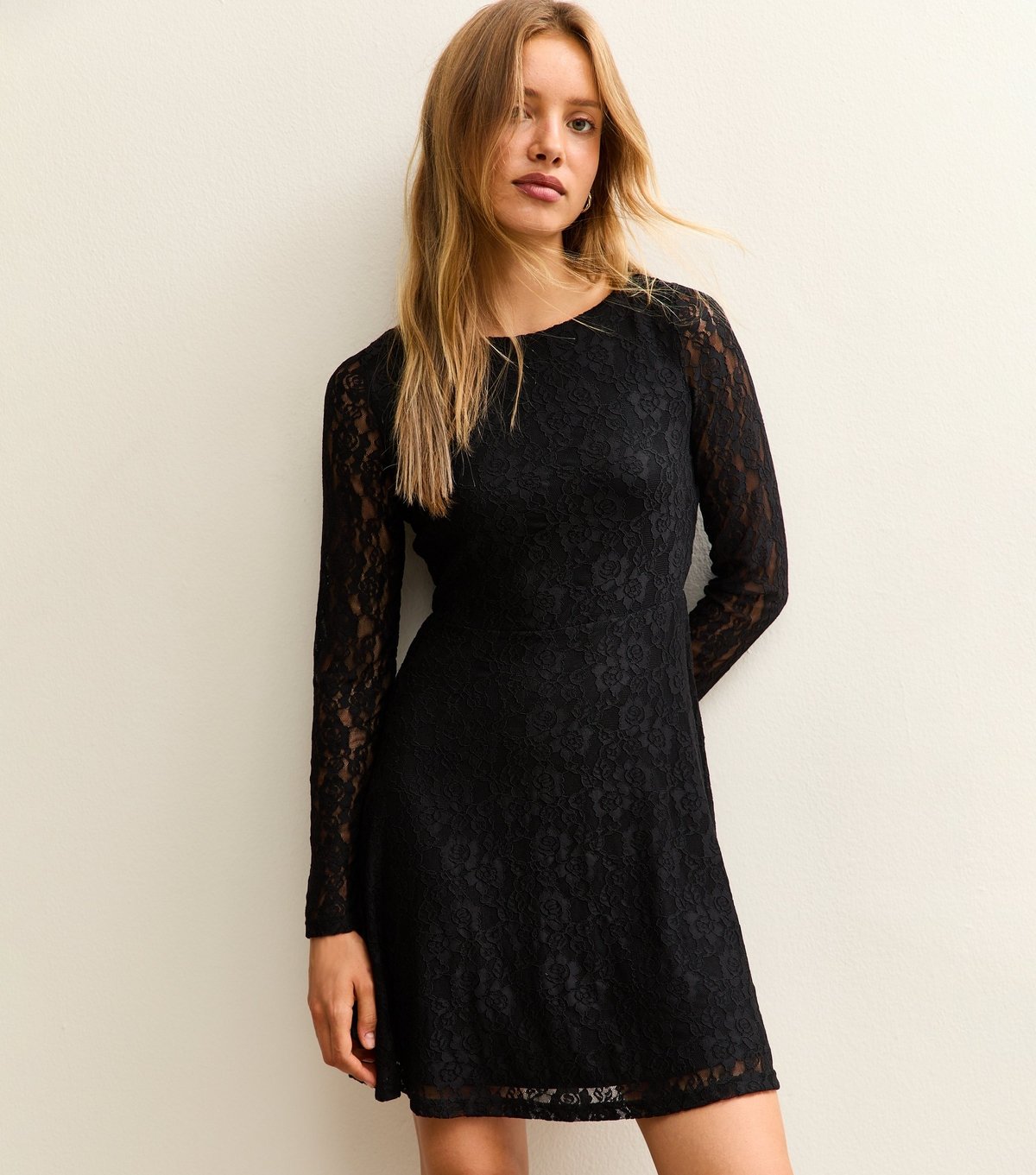 The New Look Black Lace Skater Mini Dress is made from lace.
