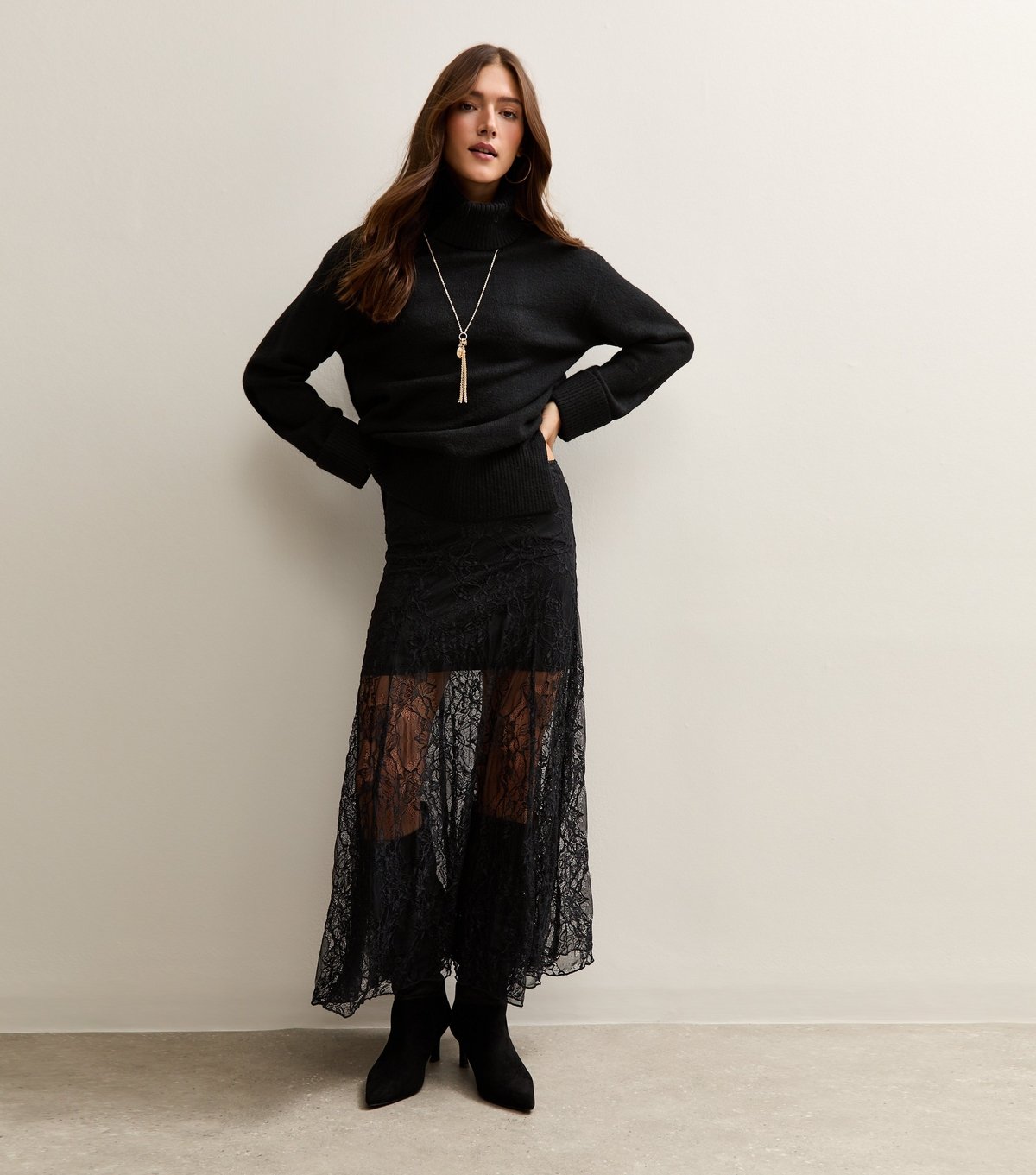 The New Look Black Lace Midi Skirt is available in sizes 10.