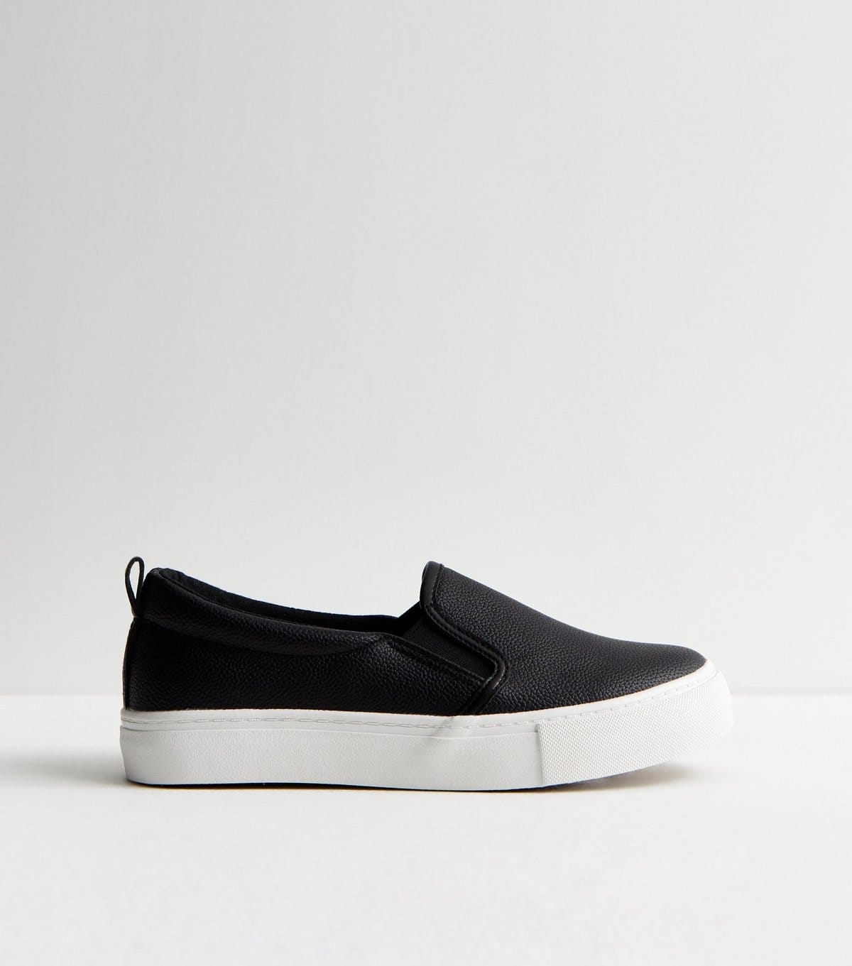 The New Look Black Leather-Look Slip On Trainers is available in sizes 2, 4.