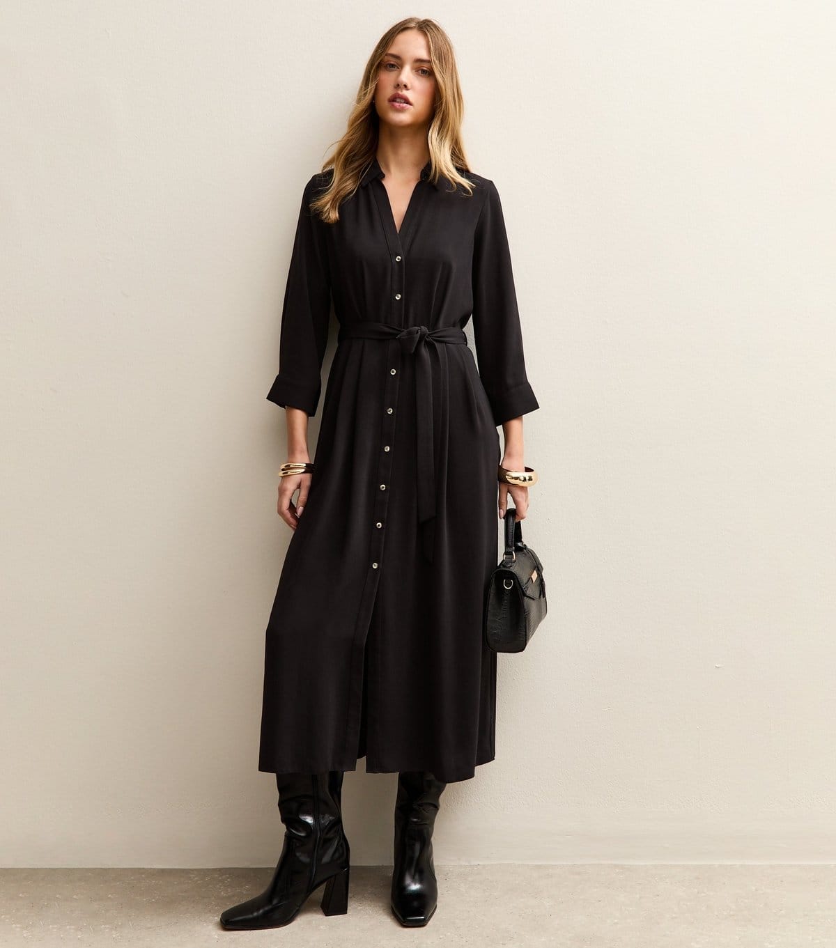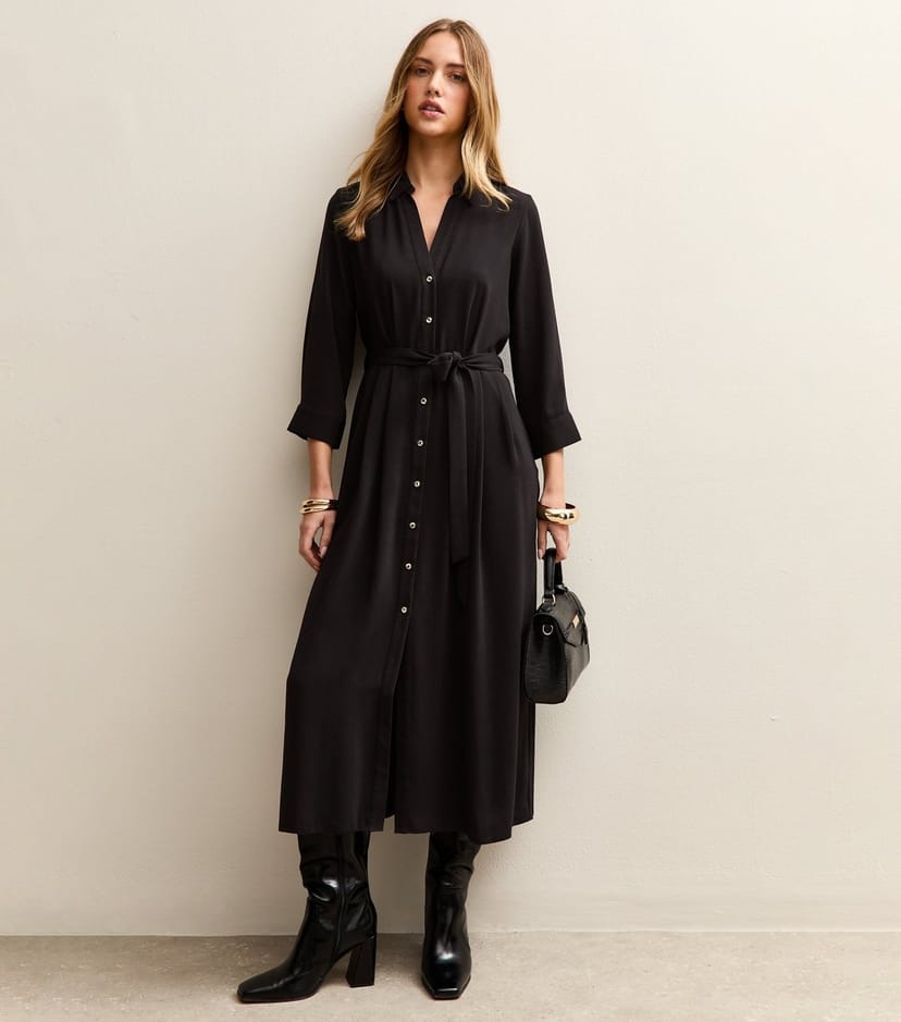 The New Look Black Crepe Midi Shirt Dress is made from crepe.