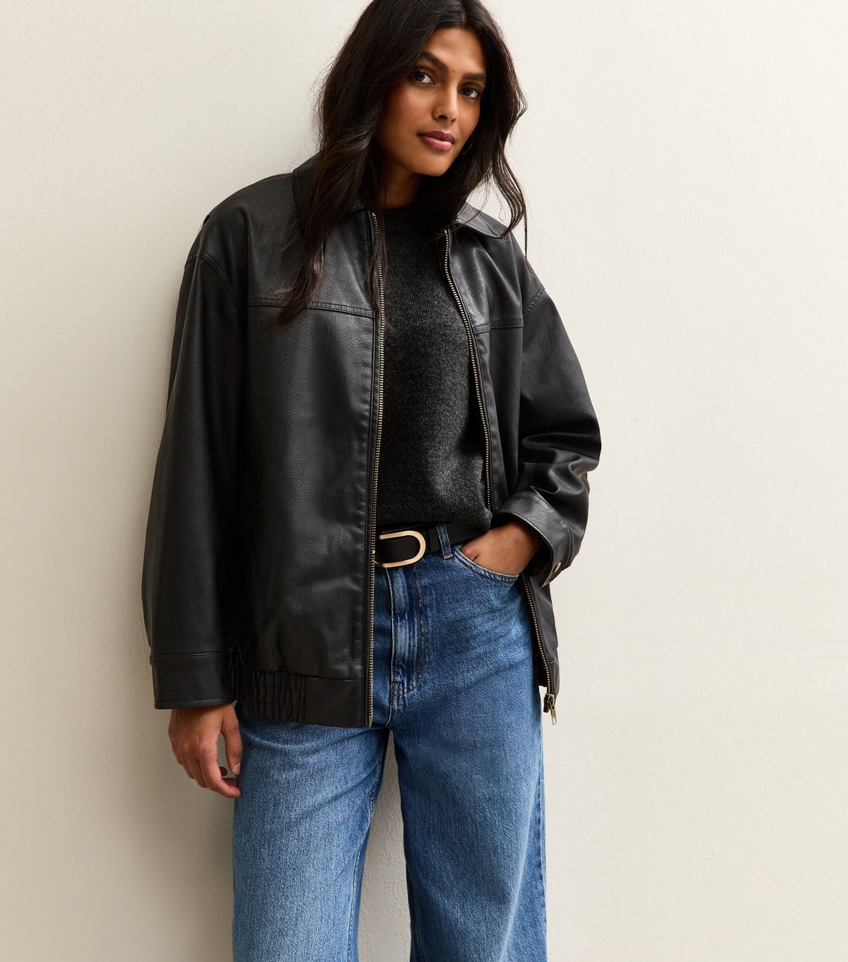 The New Look Black Oversized Faux Leather Jacket is ideal for casual, everyday.
