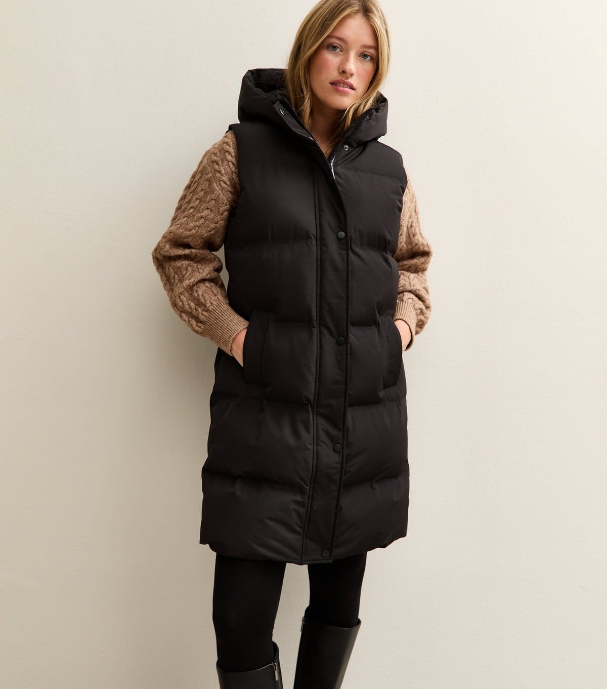 The New Look Black Padded Tiered Midi Gilet is available in sizes 12.