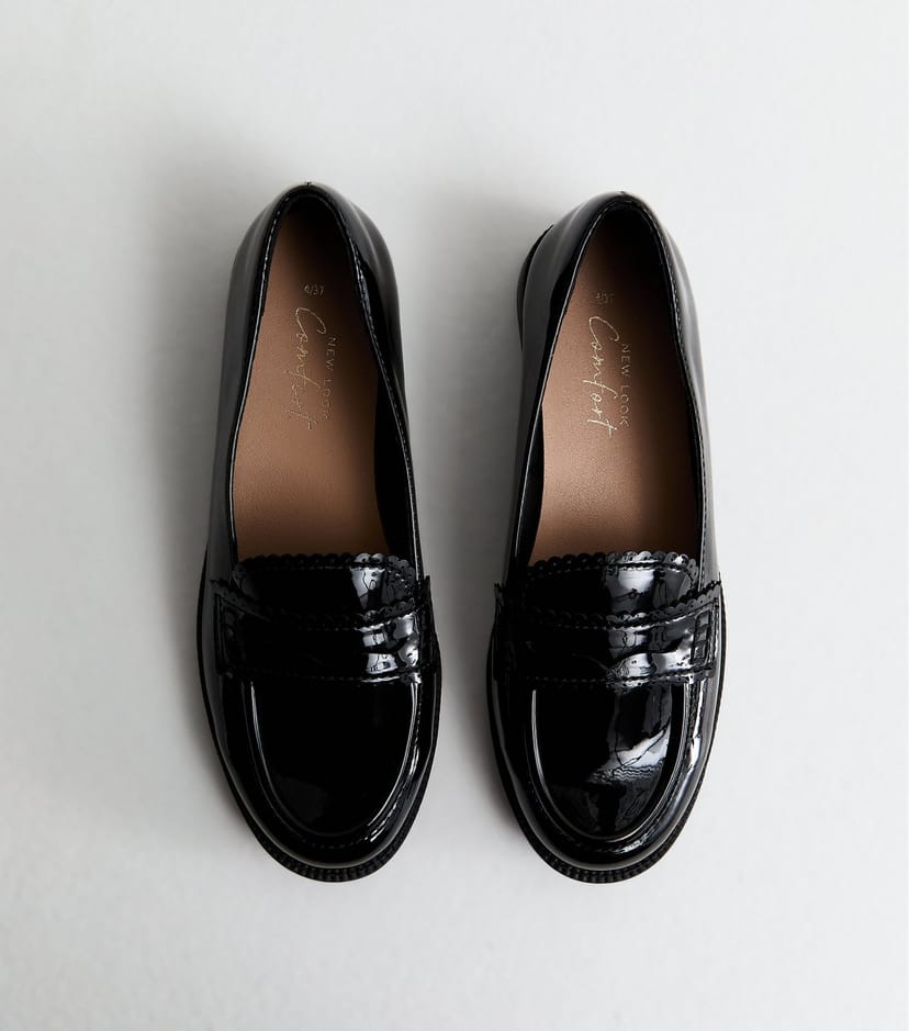 Classic black patent loafers from New Look. Made from faux leather with a shiny finish. Features a penny strap and a scalloped tongue. Perfect for a polished look.