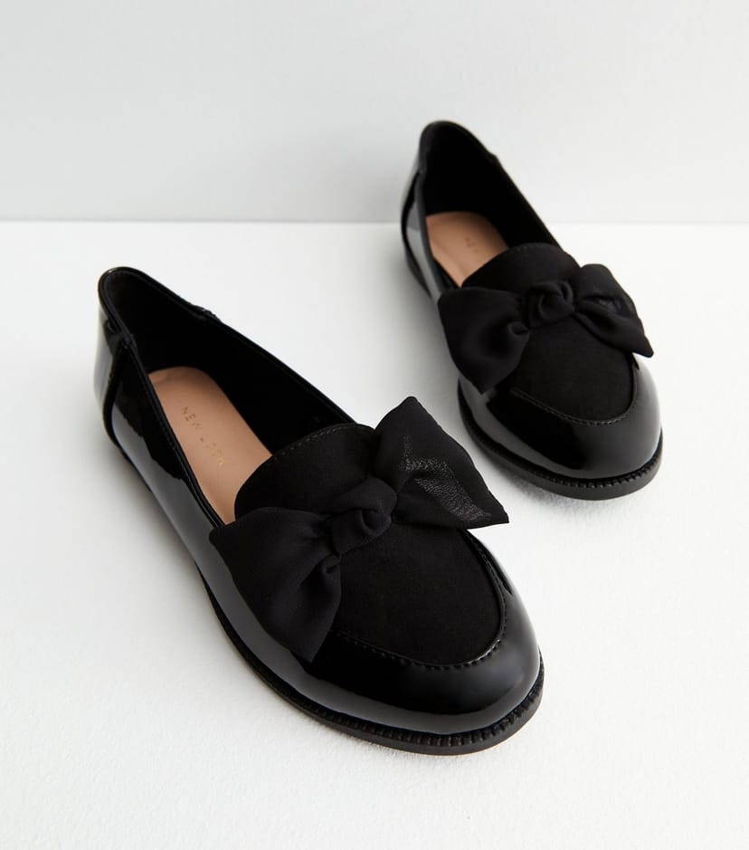 View New Look UK's returns policySophisticated black patent loafers with a shiny finish and bow detail. Perfect for smart occasions. Features soft suedette and a patent finish, improved comfort lining, and a slip-on design.