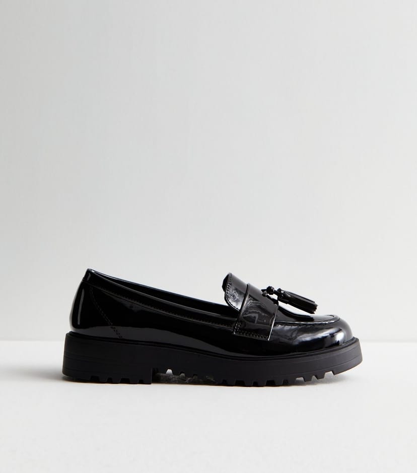 Classic black loafers with a patent finish and chunky sole. The slip-on design features a rounded toe and tassel trim. Perfect for school, college, and work.