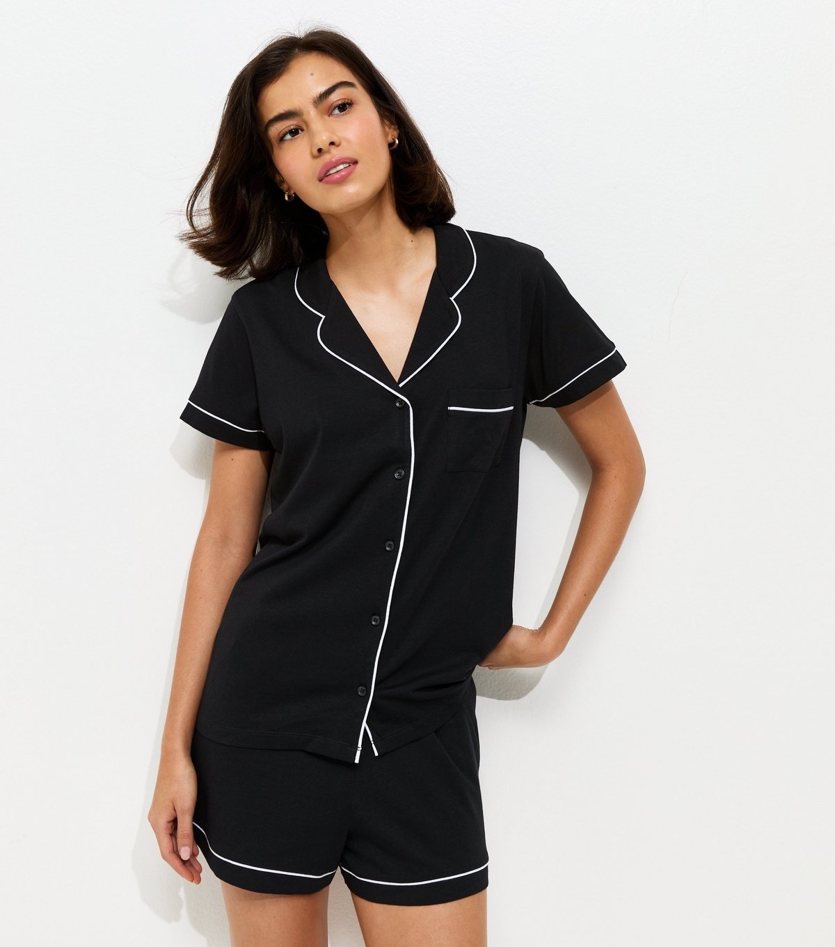 Comfortable black jersey pyjama set with a revere collar and short sleeves. Features contrast white piping for a stylish touch. Ideal for lounging or sleeping.