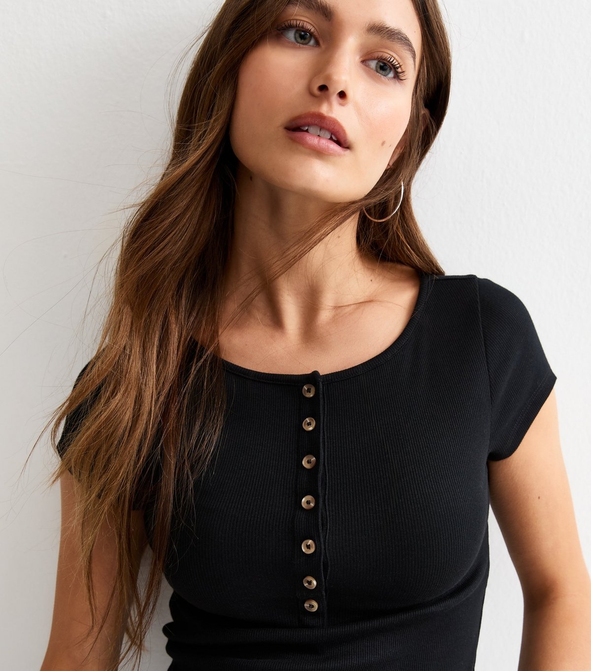 The New Look Black Ribbed Jersey Henley Top is made from jersey.