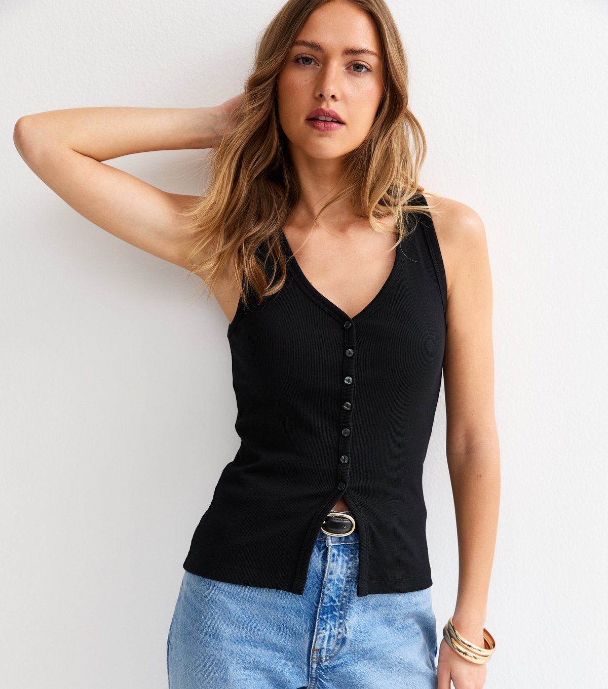 Stylish black ribbed jersey vest top with a V-neckline and button-through front. Slim fit and sleeveless design for a modern look. Ideal for casual outings.