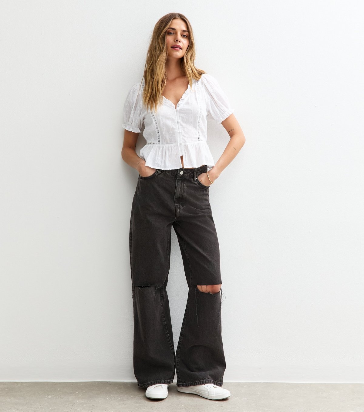 Casual and stylish, these black ripped knee jeans from New Look feature a relaxed fit and a high-waisted silhouette. The rippling details add a trendy touch, perfect for everyday wear.