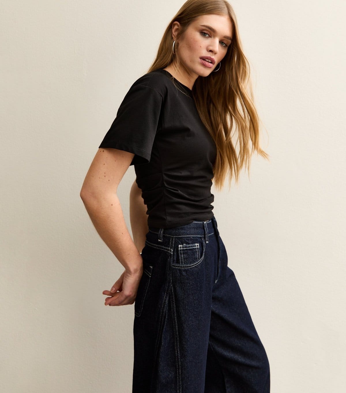 The New Look Black Ruched Waist Crew Neck T-Shirt is made from cotton jersey.