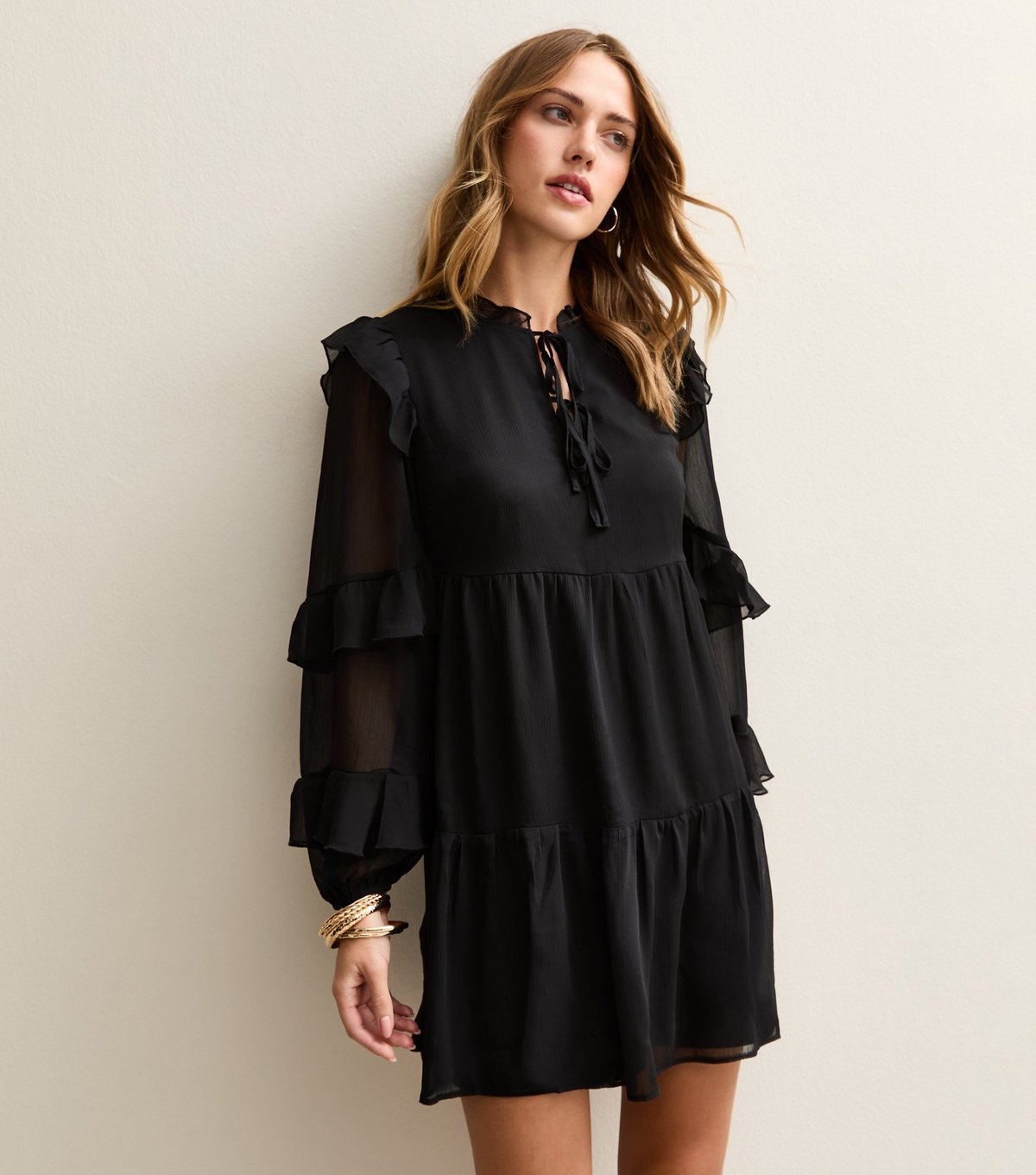 This black chiffon mini dress from New Look is perfect for effortless style. It features a tie neck, airy ruffle-trimmed sleeves, and a relaxed fit. Ideal for casual days or evenings out.