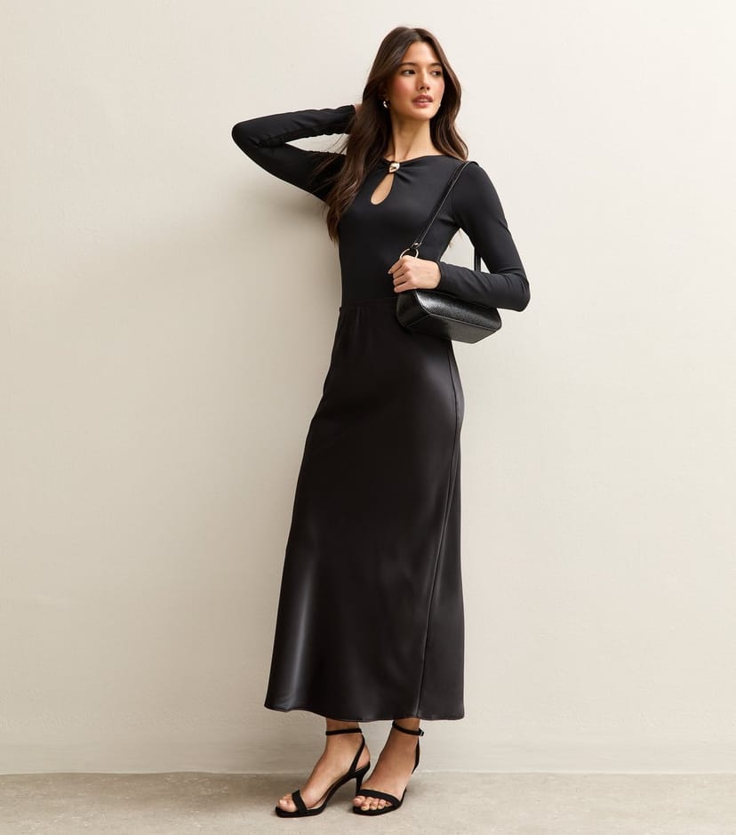 The New Look Black Satin Long-Sleeve Dress is available in sizes 10, 12, 14, 18, 20, 22.