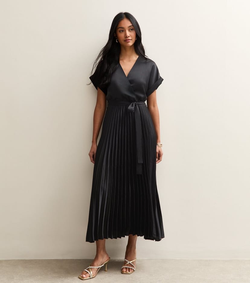 The New Look Black Satin Pleated Wrap Midi Dress is ideal for evening, date-night, party.