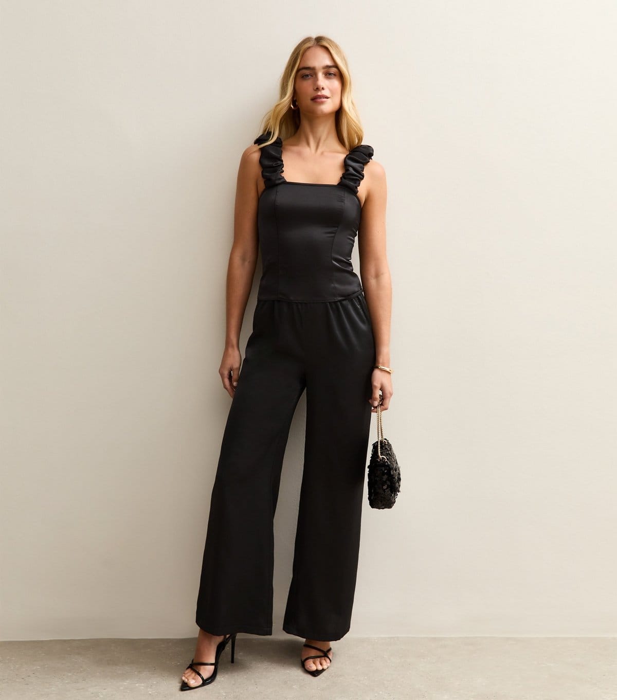 The New Look Black Satin Ruched Strap Jumpsuit is made from satin.