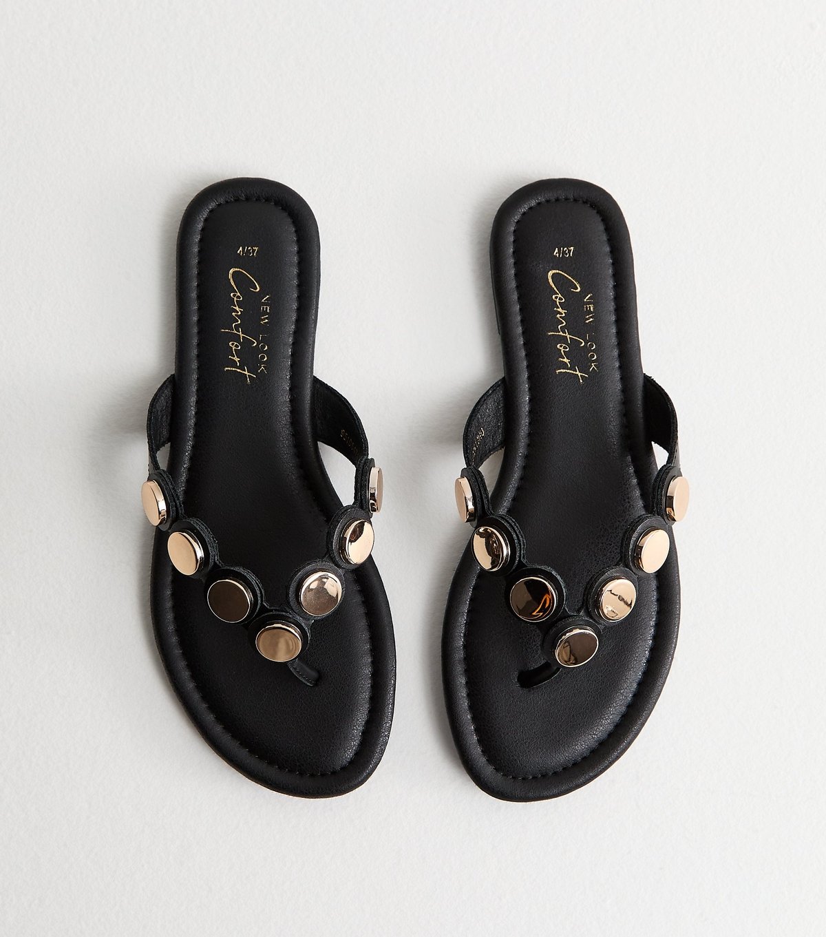 Stylish black faux leather sandals with a scalloped strap and metallic coin trim. Perfect for a relaxed day out or casual outings.