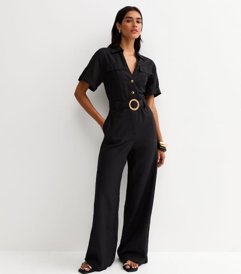 This black belted jumpsuit by New Look is a lightweight option perfect for warmer days. Featuring a collared neckline, short sleeves, and faux pocket details, it fastens with buttons down the front. The wide-leg pants and slim fit create a flattering silhouette.