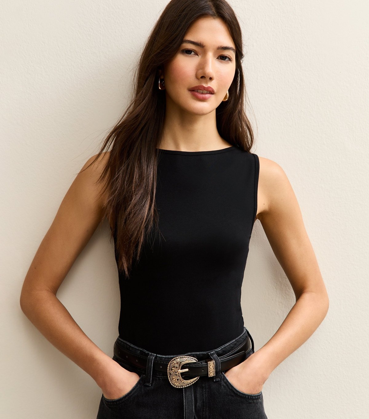 This black sleeveless scoop-neck bodysuit from New Look offers all-day comfort with its flexible jersey construction. It is a wardrobe essential that is sure to be worn on repeat from one season to the next.