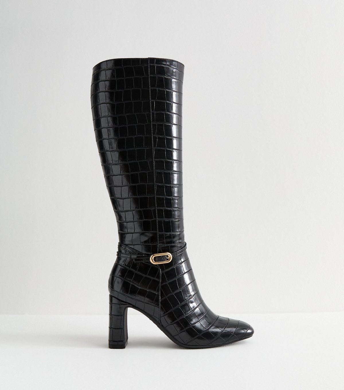 The New Look Black Faux Leather Knee High Boots is available in sizes 3, 7, 9.