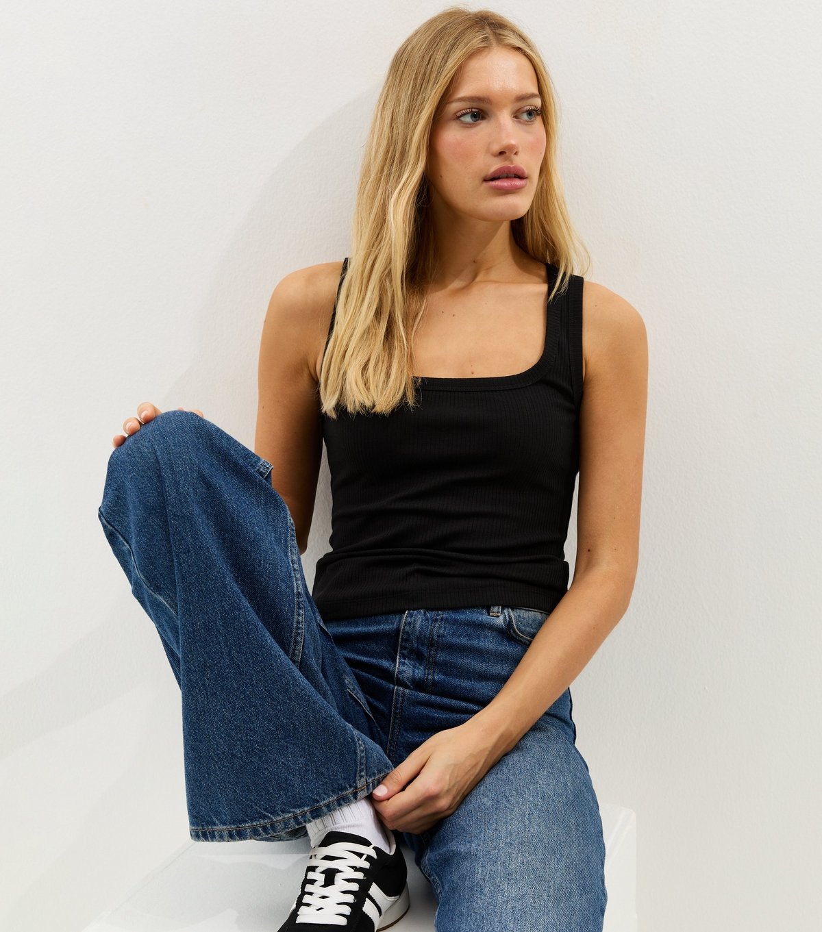 This black square neck vest top by New Look is crafted from stretchy rib jersey for a comfortable fit. It features a slim fit and a regular length, making it versatile for both casual and evening looks.