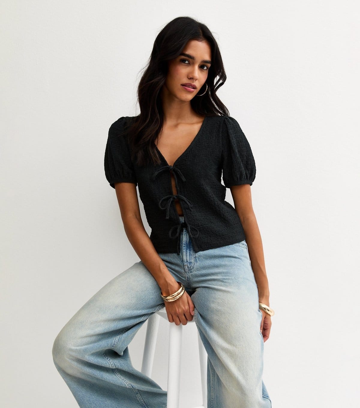 Playful and stylish, this black textured top features a tie-front detail and puff sleeves with elasticated cuffs. Ideal for everyday wear.