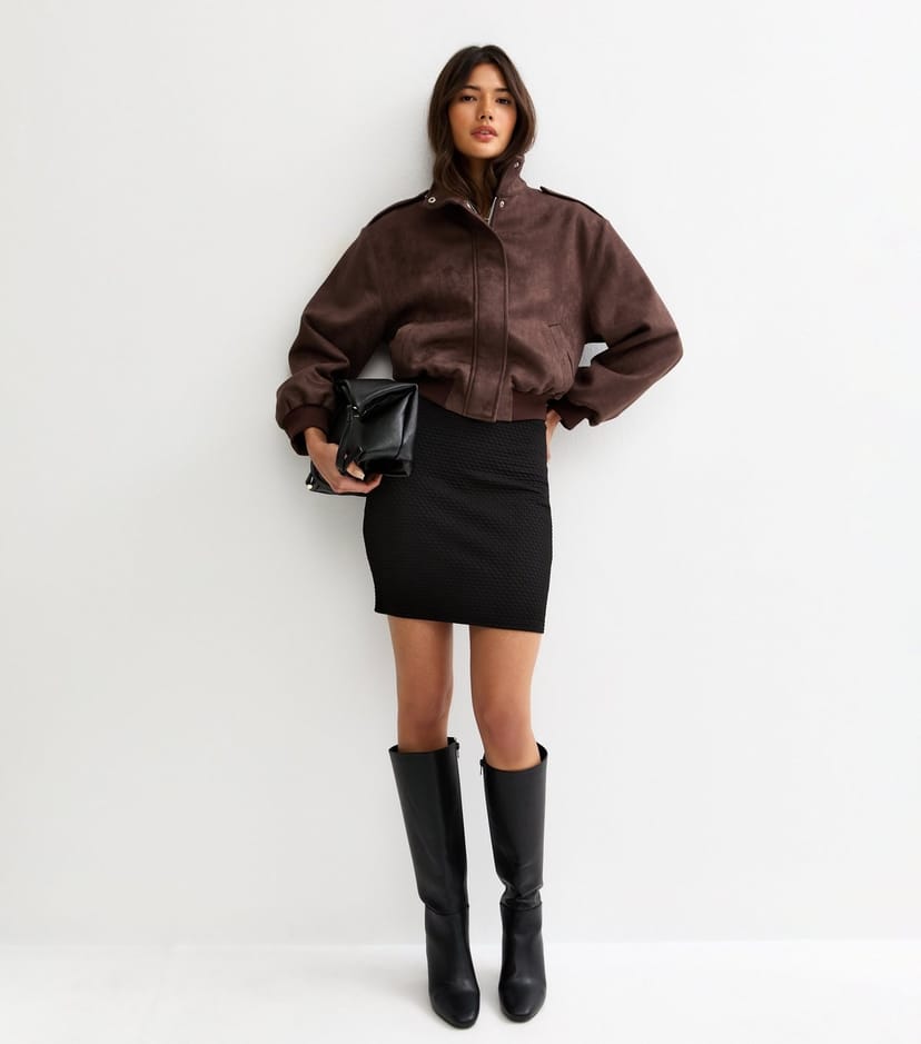 This black textured mini skirt from New Look features a geometric pattern for a modern edge. The stretchy fabric ensures a comfortable, slim fit. Ideal for nights out or casual day looks.
