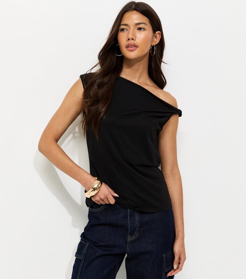 The New Look Black Textured Twist Shoulder Top is ideal for casual, evening, date-night.
