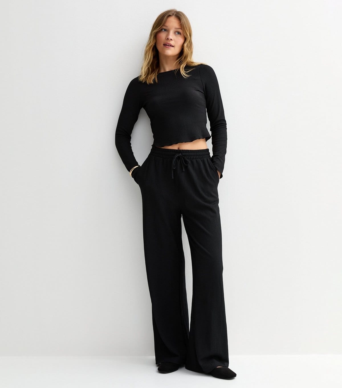 See all outfit ideasEffortless wide-leg trousers in textured jersey with a relaxed fit. Perfect for a casual daytime look, pair with ballet flats or chunky sneakers.