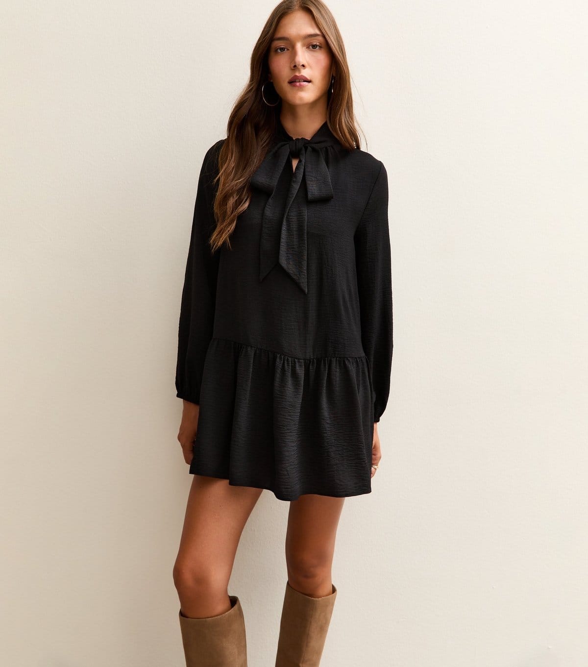 The New Look Black Tie Neck Smock Mini Dress is ideal for casual, everyday, date-night.