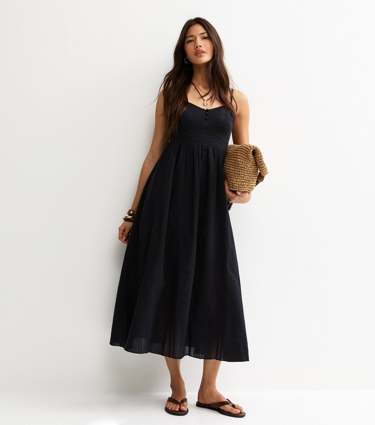 The New Look Black V-Neck Strappy Midi Dress is available in sizes 10, 12, 14, 16, 18, 20, 22, 6, 8.