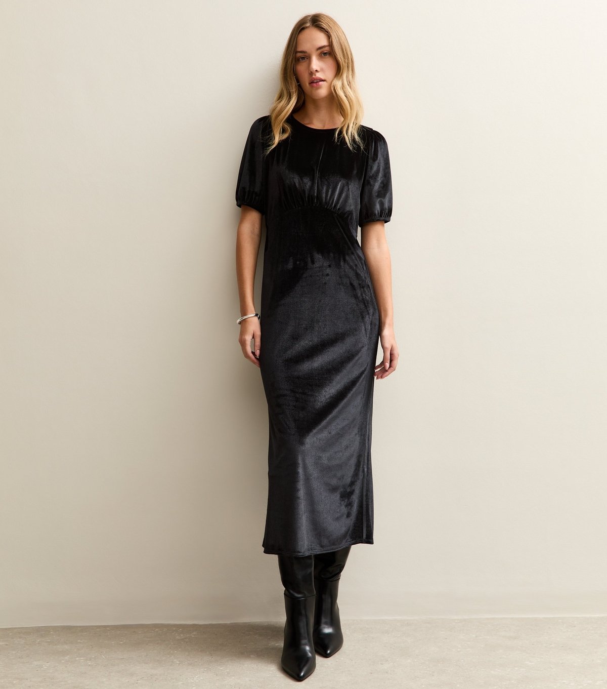 The New Look Black Velvet Puff Sleeve Midi Dress is made from velvet.