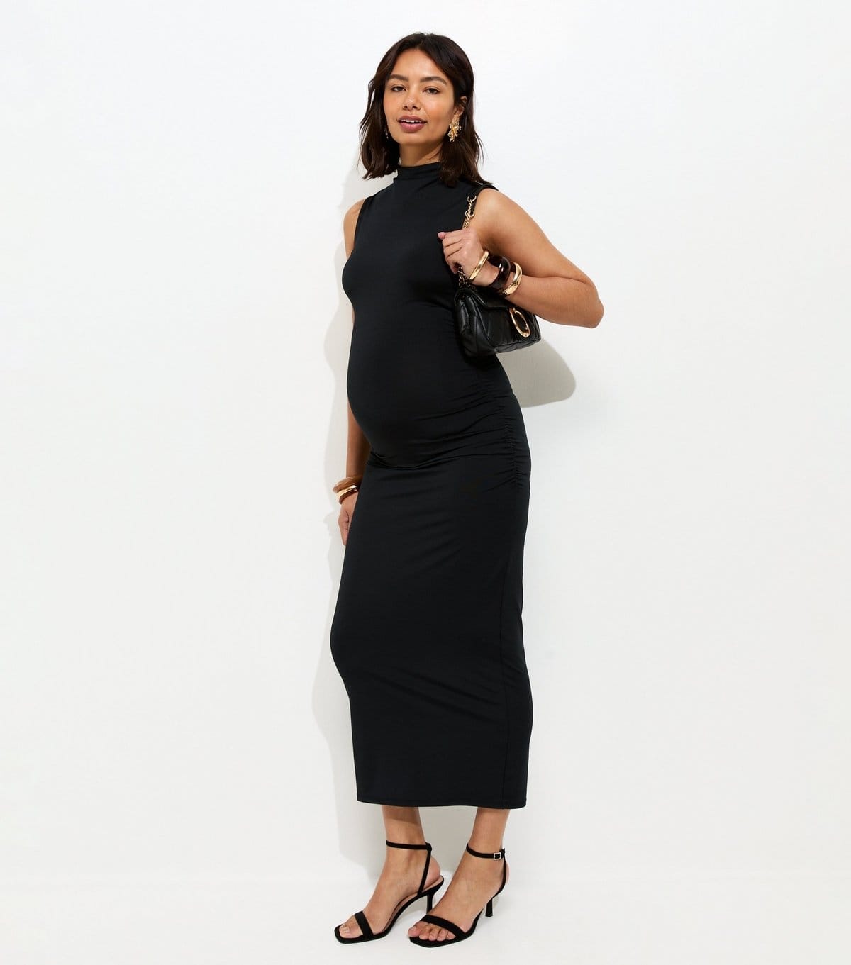 Stylish black jersey midi dress with a high neck and figure-skimming silhouette. Designed for maternity wear, it offers comfort and elegance for casual days.