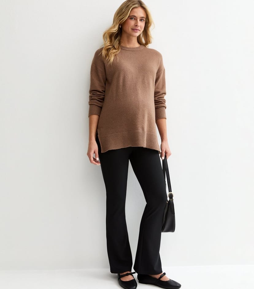 Pair with a camel oversized jumper and black pointed-toe ankle boots for a chic maternity look.