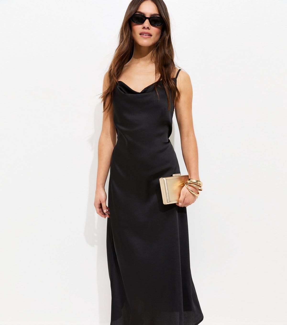 The New Look Black Satin Cowl Neck Midi Dress is made from satin.