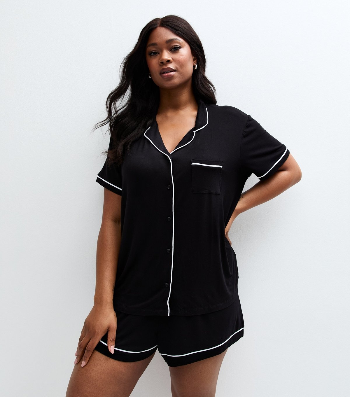 The New Look Plus Size Black Contrast Piping Pyjama Set is available in sizes 26.
