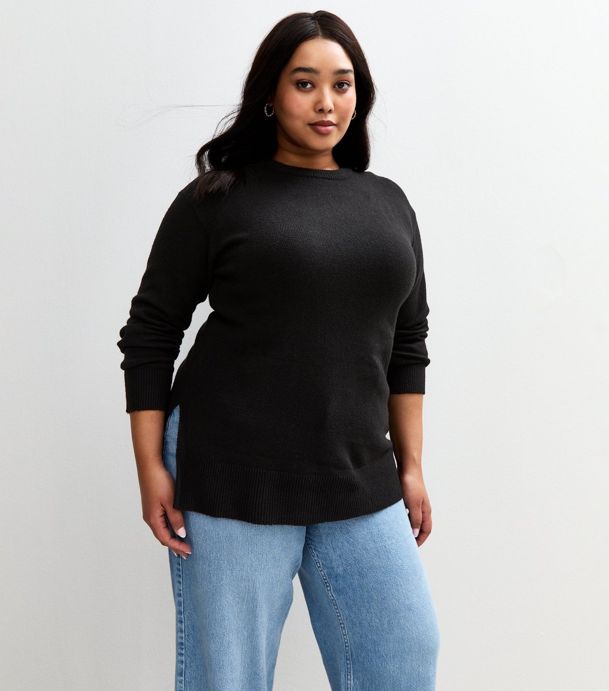 This black knit jumper from New Look features a crew neck and split hem detail. It's perfect for a relaxed fit and regular length, making it an easy combination with tailored jeans or trousers.