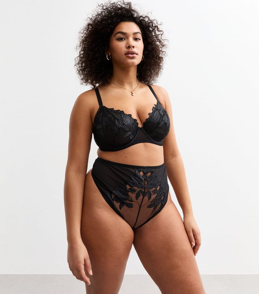 Stylish black mesh balconette bra with adjustable straps and floral satin appliques. Paired with a high waisted thong featuring sheer panels and floral appliques. Perfect for a plus size fit.