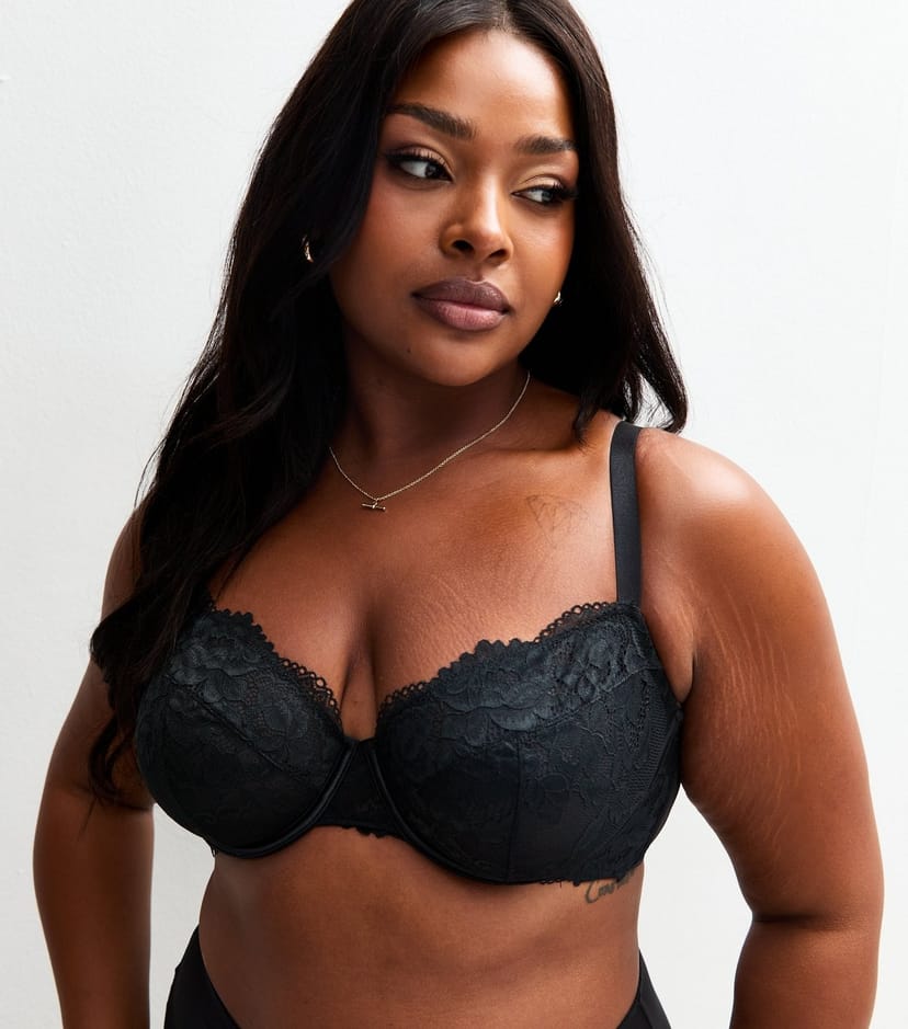 The New Look Black Lace T-Shirt Bra for Plus Sizes is available in sizes 40C, 40D, 40DD, 40E, 42C, 42D, 42E, 44C, 44D.