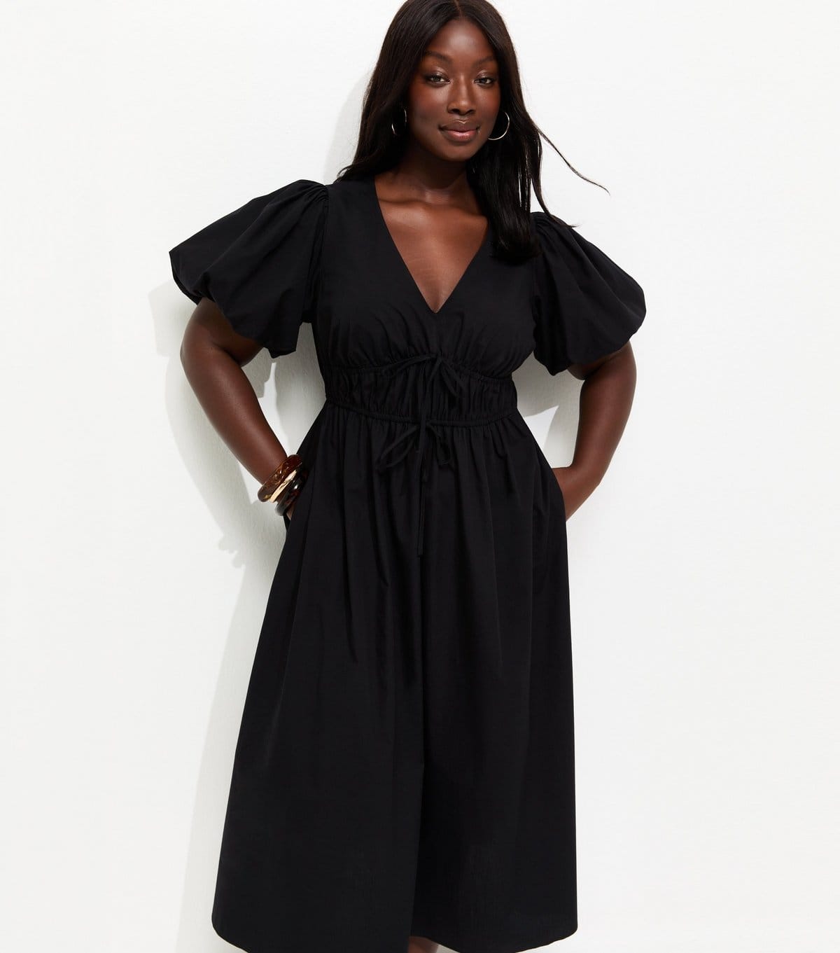 The New Look Black Plus Size Puff Sleeve Midi Dress is available in sizes 18, 20, 22, 24, 26, 28, 30, 32.