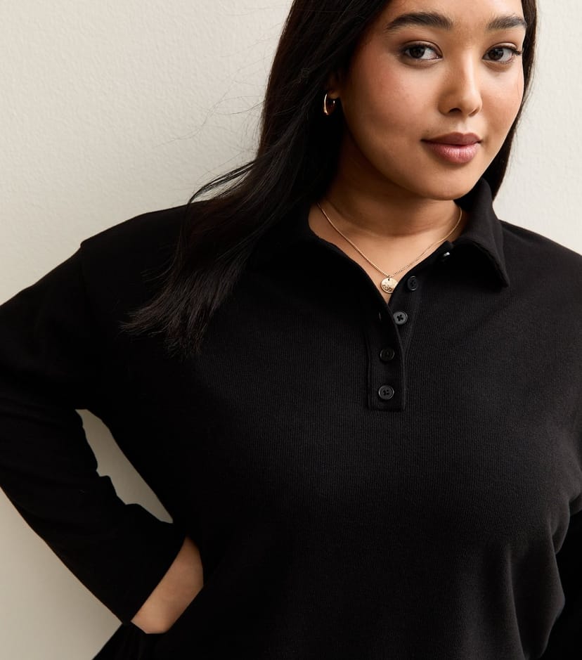 The New Look Black Ribbed Long Sleeve Polo Top for Women is available in sizes 18, 22, 26, 30.
