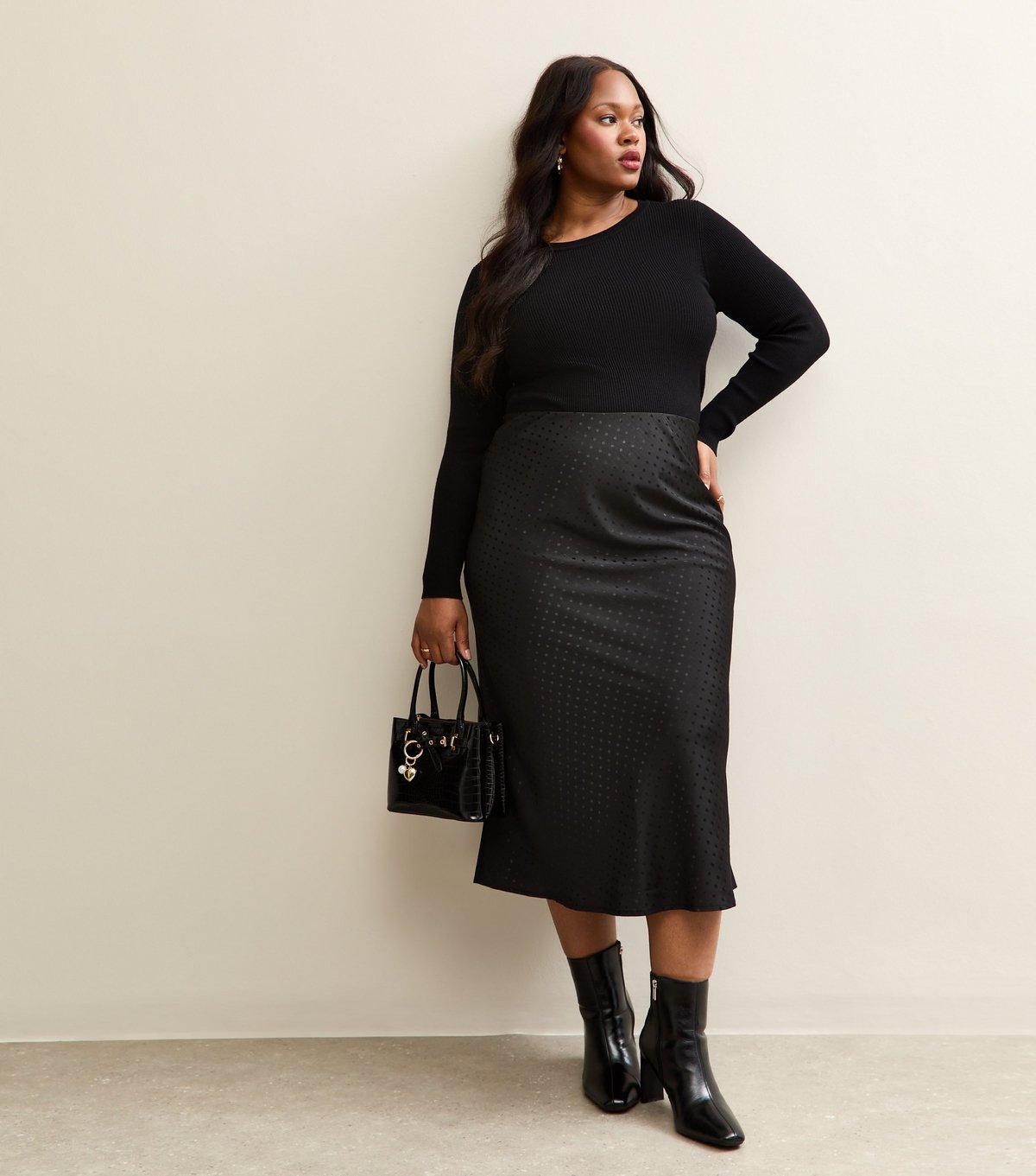 This black satin midi skirt from New Look is designed to flatter plus-size figures. The bias-cut fabric creates a sleek silhouette, while the tonal spot pattern adds a touch of subtle contrast. Ideal for evening events or casual outings.