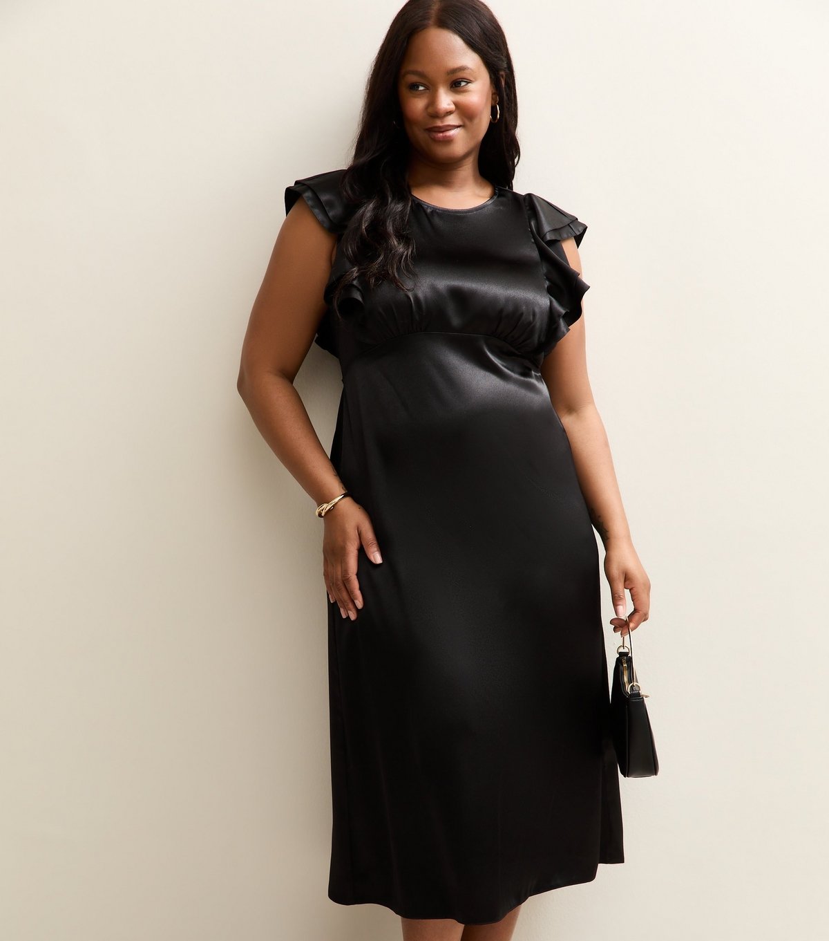 This black satin midi dress by New Look is designed for plus sizes. Featuring a flattering A-line silhouette and ruffled sleeves, it's perfect for special occasions. The satin fabric adds a touch of elegance.