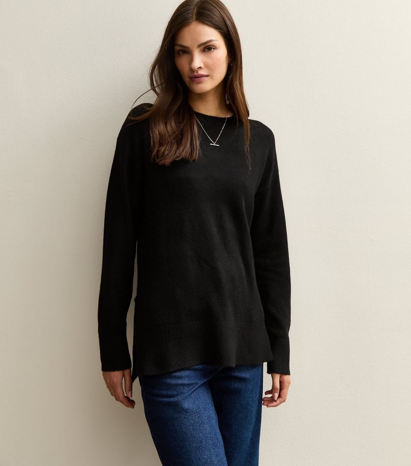 This black knit jumper from New Look is a relaxed-fit, longline crew neck piece. Perfect for layering, it features ribbed trims and side splits for a modern touch.