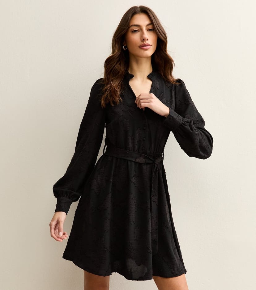 The New Look Black Jacquard V-Neck Belted Mini Dress is available in sizes 10.