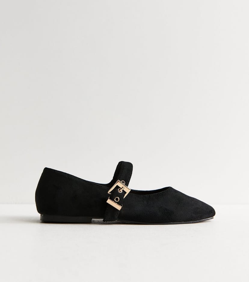 View New Look UK's returns policyCharming Mary Jane flats in black faux suede with a classic design. Perfect for everyday wear with a gold buckle detail. Vegan-friendly and comfortable.