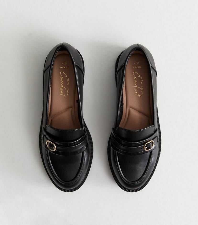 The New Look Black Vegan Penny Loafers is available in sizes size 5 - wide fit, size 6 - wide fit, size 7 - wide fit.