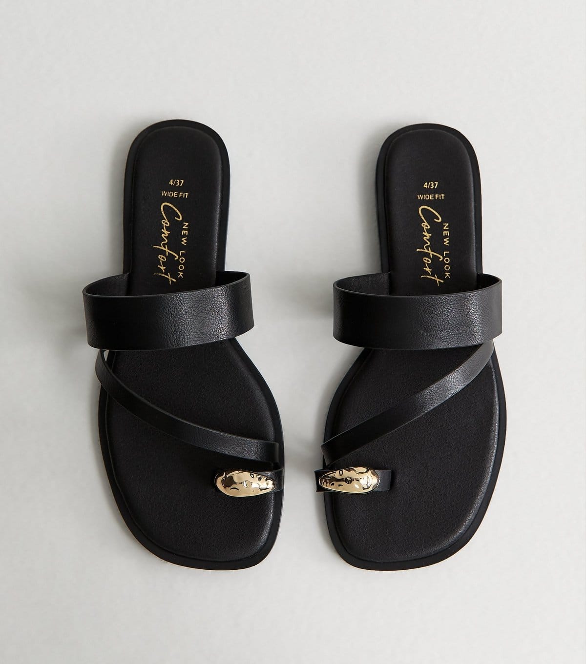 Sleek black faux leather mules with a metal toe ring detail. Designed for wide fit comfort, these sandals are perfect for both casual and evening wear. The glimmering hardware adds a touch of elegance.
