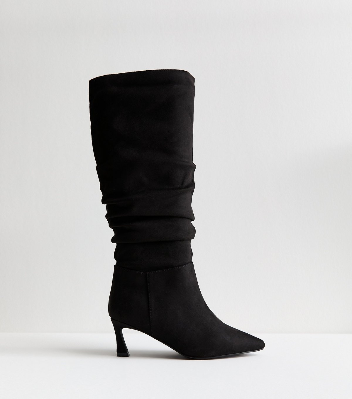 The New Look Black Faux Suede Ruched Knee High Boots is available in sizes SIZE 8 - WIDE FIT.