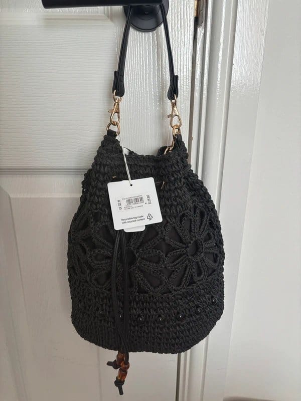 Stylish black woven bucket bag with intricate floral crochet detail and a drawstring closure. Perfect for adding a boho touch to any outfit.