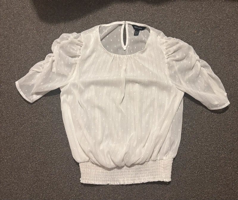 “Pair with high-waisted black trousers and white ballet flats for a chic daytime look.”