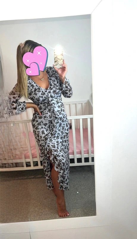 Stunning blue floral print midi dress with a V neckline & long sleeves. Made from chiffon material with a concealed side zip fastening and lined body. The dress features a ruffle trim detail and looks lovely on.
